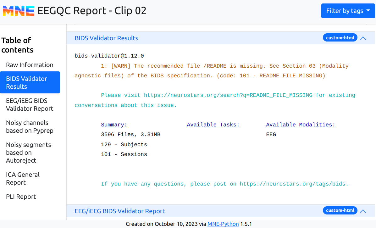 In this context, we introduce EEGQC, a pioneering tool designed to establish a standardized framework for quality control in EEG and iEEG data analysis. Adhering to the principles of the Brain Imaging Data Standard (BIDS), EEGQC generates detailed HTML reports for each data file, systematically organized within a BIDS directory structure derived from the input directory. An illustrative example of such a report is provided below: